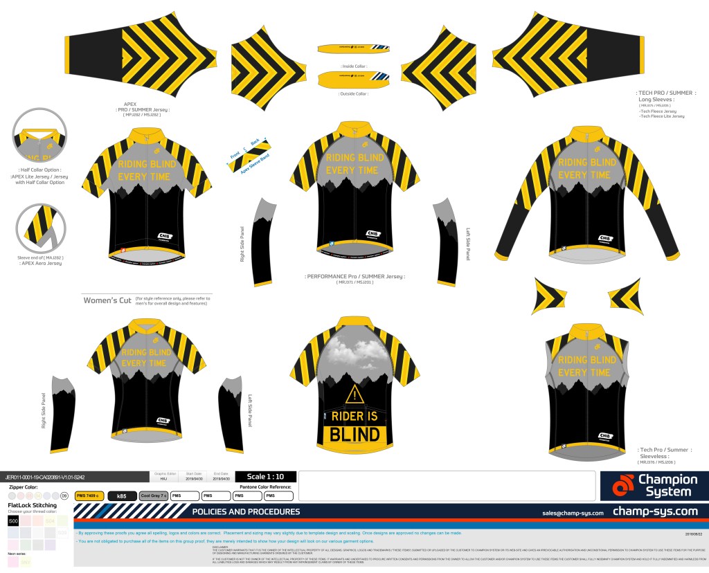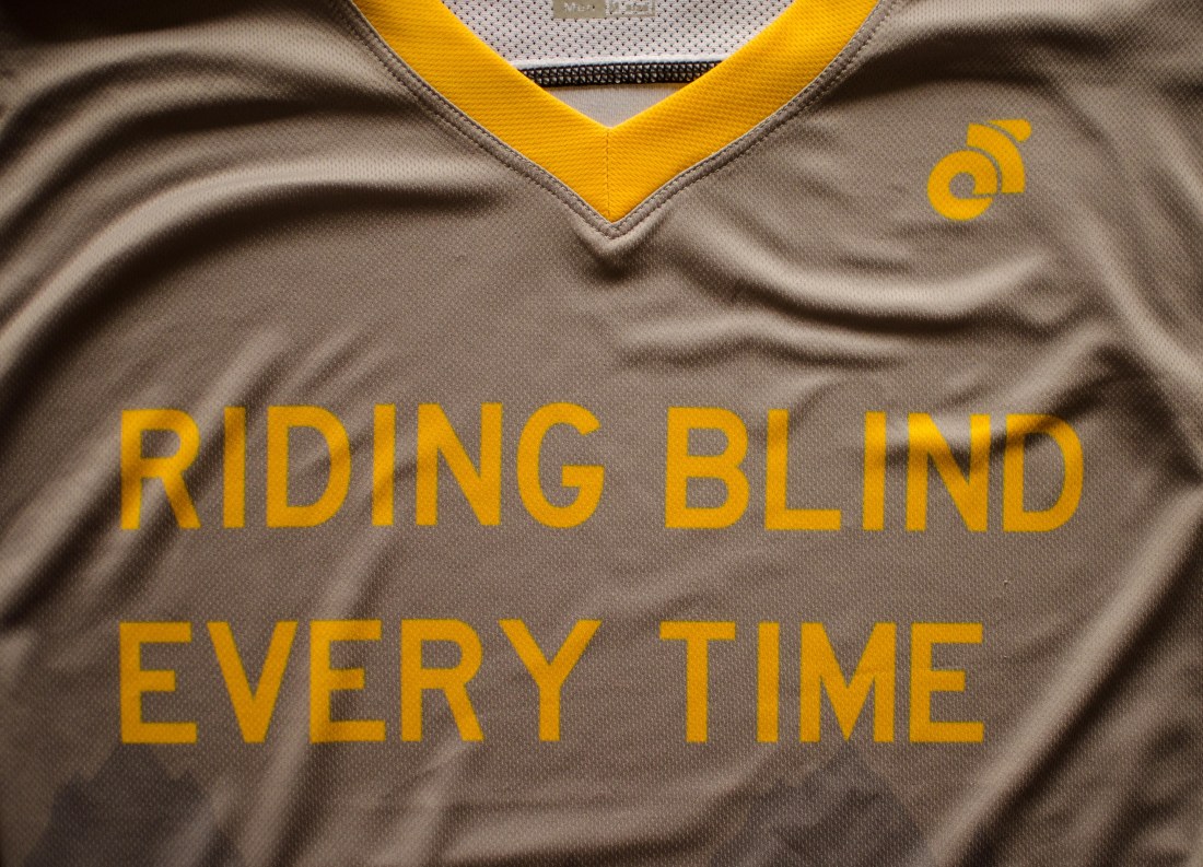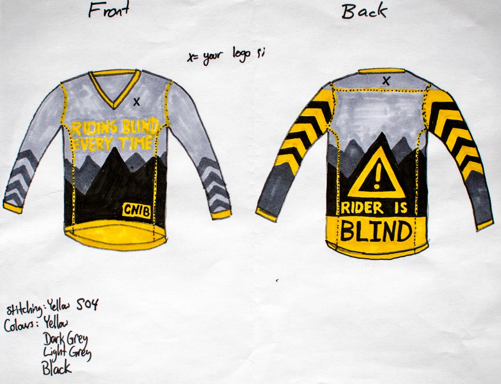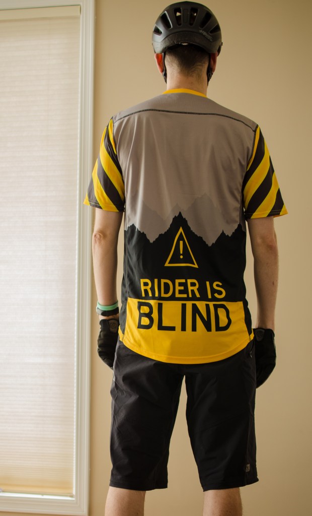 You’ll also notice a little CNIB logo (Canadian National Institute for the Blind) on the front. I had hoped to include the organization’s logo simply because I’ve been stopped and asked a few times about how I bike while ‘blind’ or how ‘blind’ I am. I figured the jersey might be a good conversation starter and possibly a good chance to refer people to CNIB as a source of additional information on vision loss.