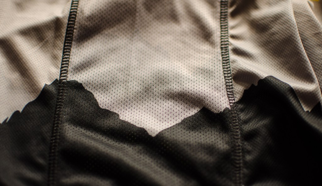 The material is incredibly soft, light and breathable. The sleeves are a single piece of fabric, so it was a little difficult to keep the hazard pattern only on the back of the sleeves. But Champion System did a good job of matching the pattern where stitches are and fabric panels join.