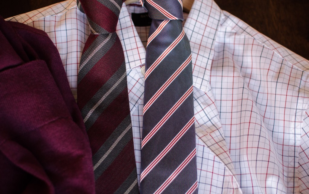 What follows are photos showing 4 dress shirts, with 4 neck ties and the same suit. There is also a white pocket square, and a grey and coloured sweater. If you remember from the last post in the series, burgundy was the one extra colour I chose for my simple, no-look wardrobe.